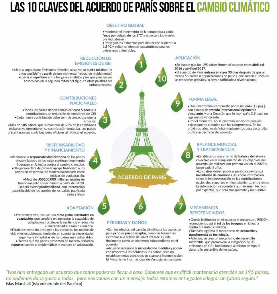 El histórico Acuerdo de París ofrece una oportunidad para que los países fortalezcan la respuesta a la amenaza del cambio climático al mantener el aumento de la temperatura mundial por debajo de 2 ºC y, teniendo en cuenta los graves riesgos que entraña, en esforzarse por lograr que no sea superior a 1,5 ºC. El Acuerdo entró en vigor el 4 de noviembre de 2016.